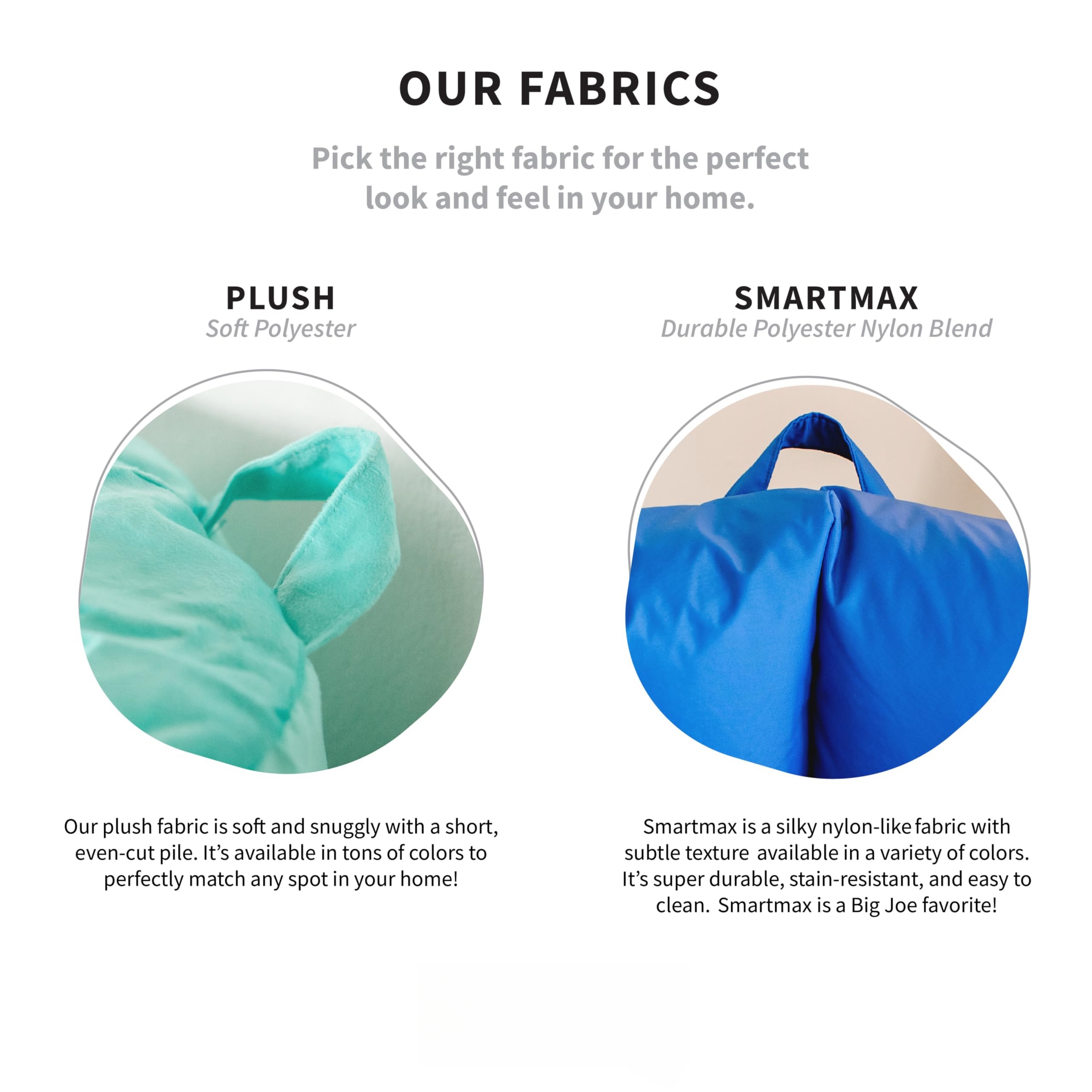 This bean bag chair is made with SmartMax Fabric: Tough, stain resistant, water-resistant, and easily cleaned with damp cloth
