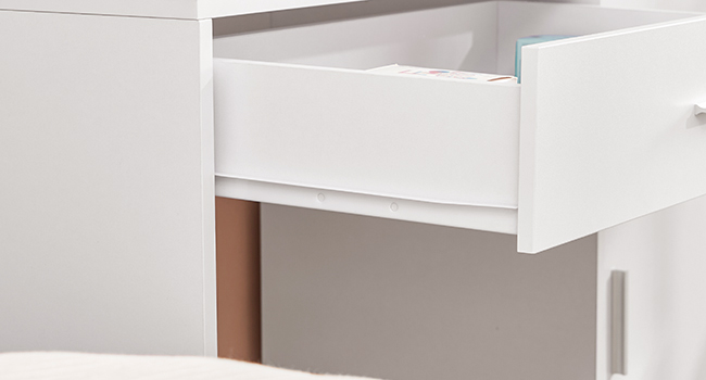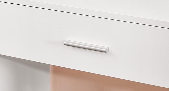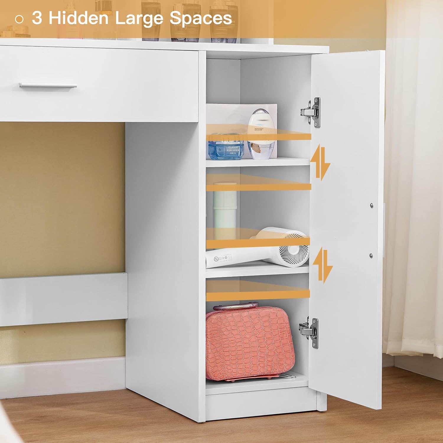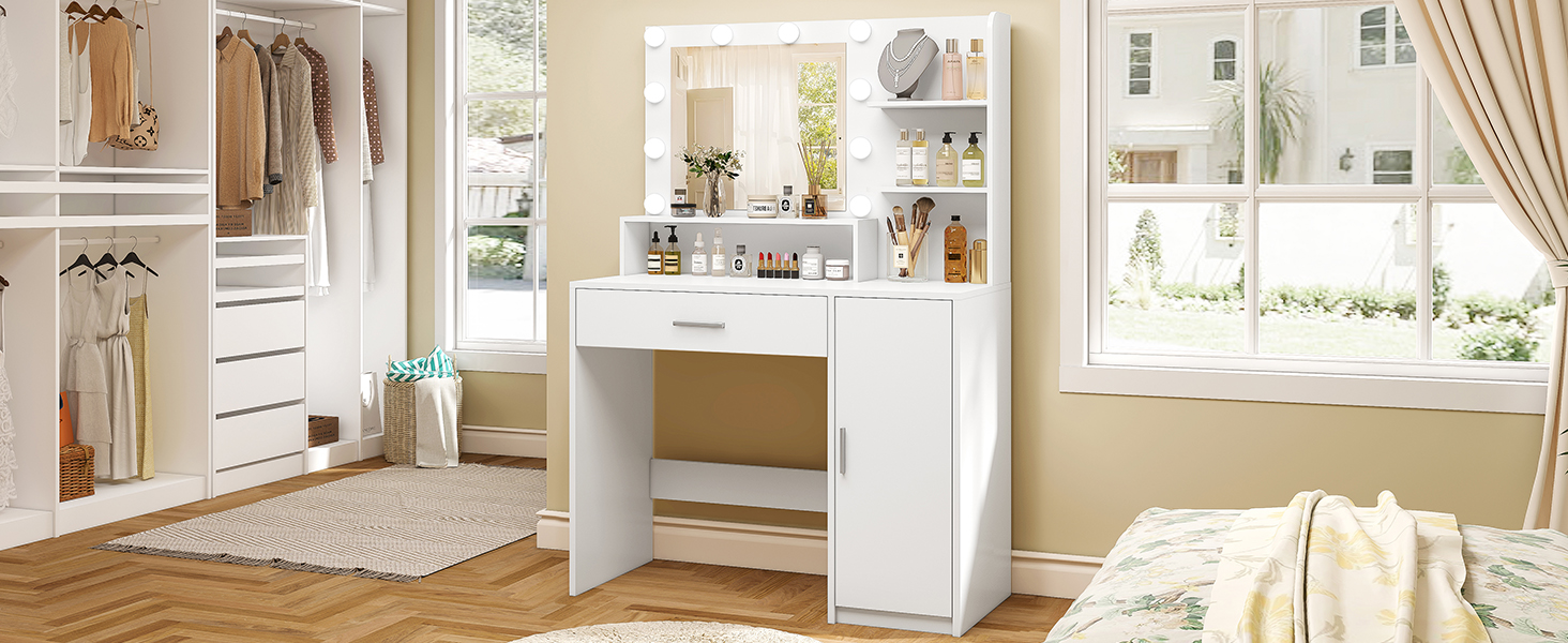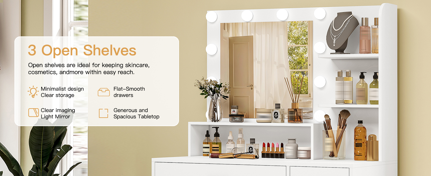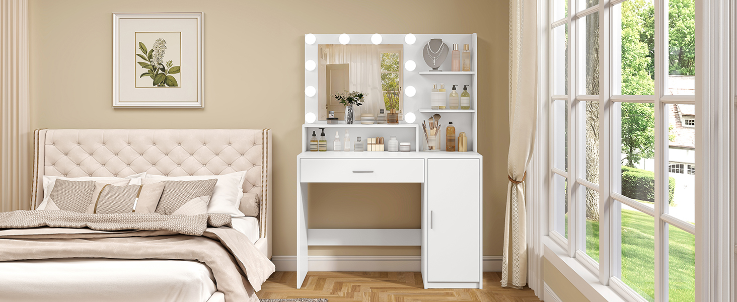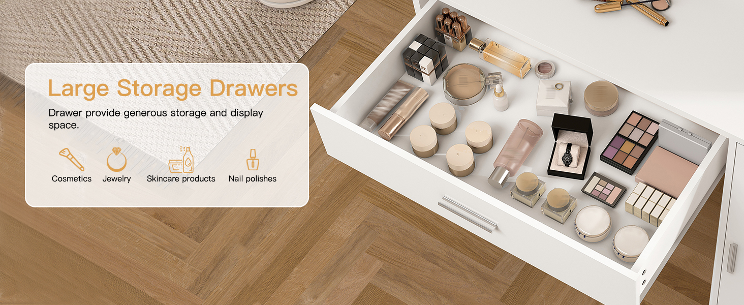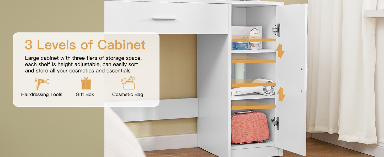 This vanity desk contains 1 oversize drawer, 3 open shelves and 1 large cabinet with 2 height adjustable shelves, provide ample space for all your cosmetics, skin care products, jewelry and other beauty supplies. The dividers in the large cabinet below has three levels of storage to allow you to sorted and stored neatly items.