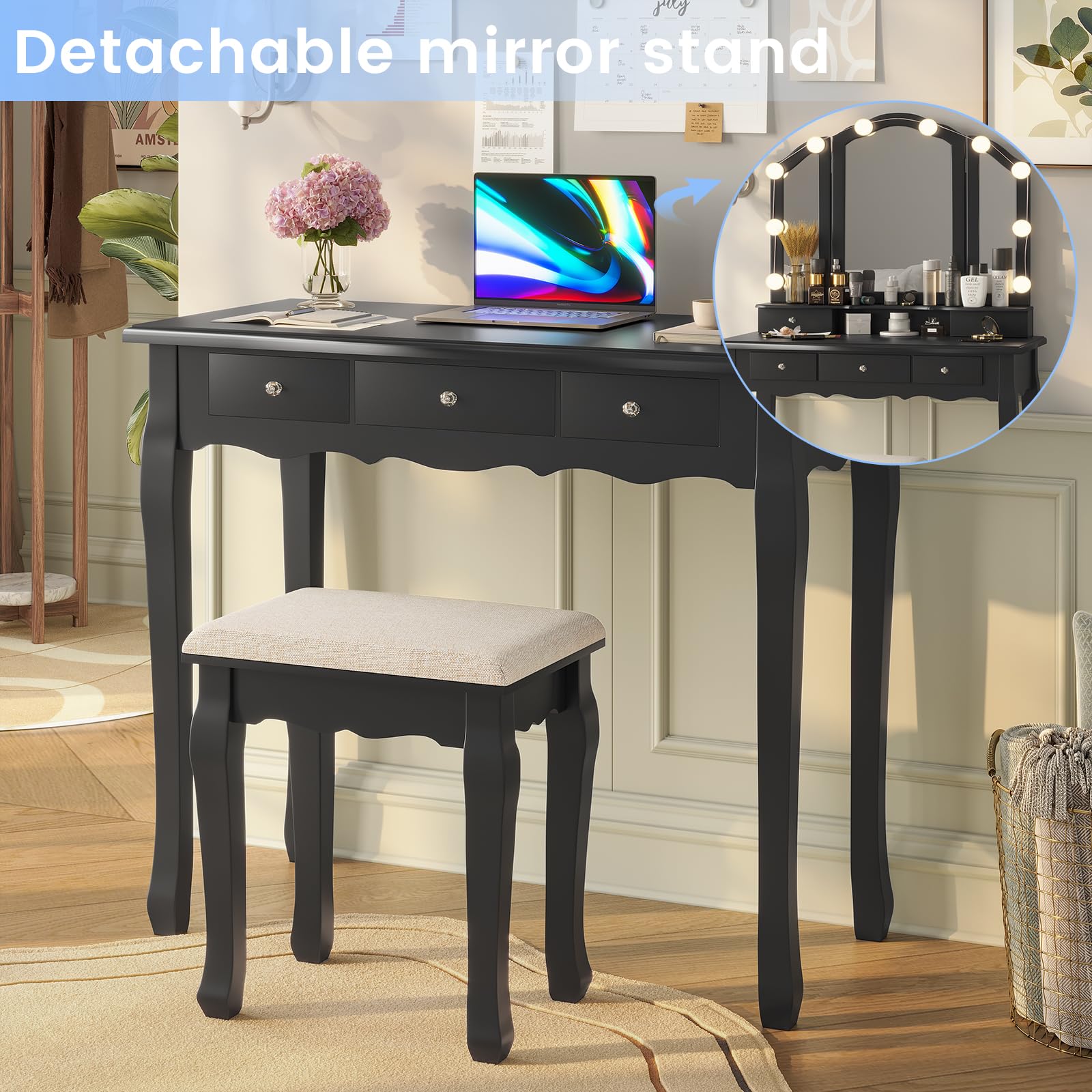 This vanity set features 10 Hollywood dimmable LED bulbs around the mirror. with 3 shades of light: warm yellow, warm white and cool white. No more unflattering shadows across your face. You'll get all you need to set the perfect mood of your beauty station and apply makeup, hairstyling and more.