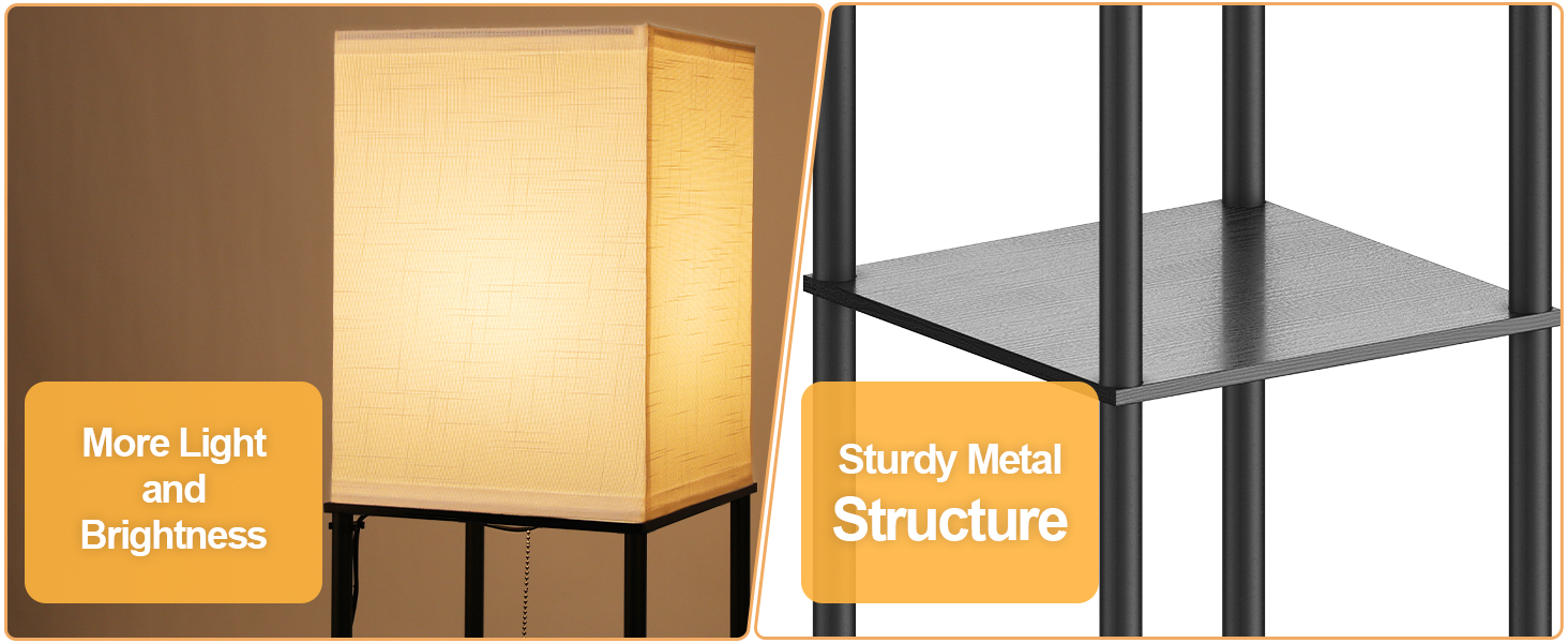 Our floor lamp with shelves is made of sturdy wood with stable structure, high loading with 50 lbs max loading capacity. This floor lamp adds ambiance to your room and provides a storage or display area for vases, books, plants, albums or other items.