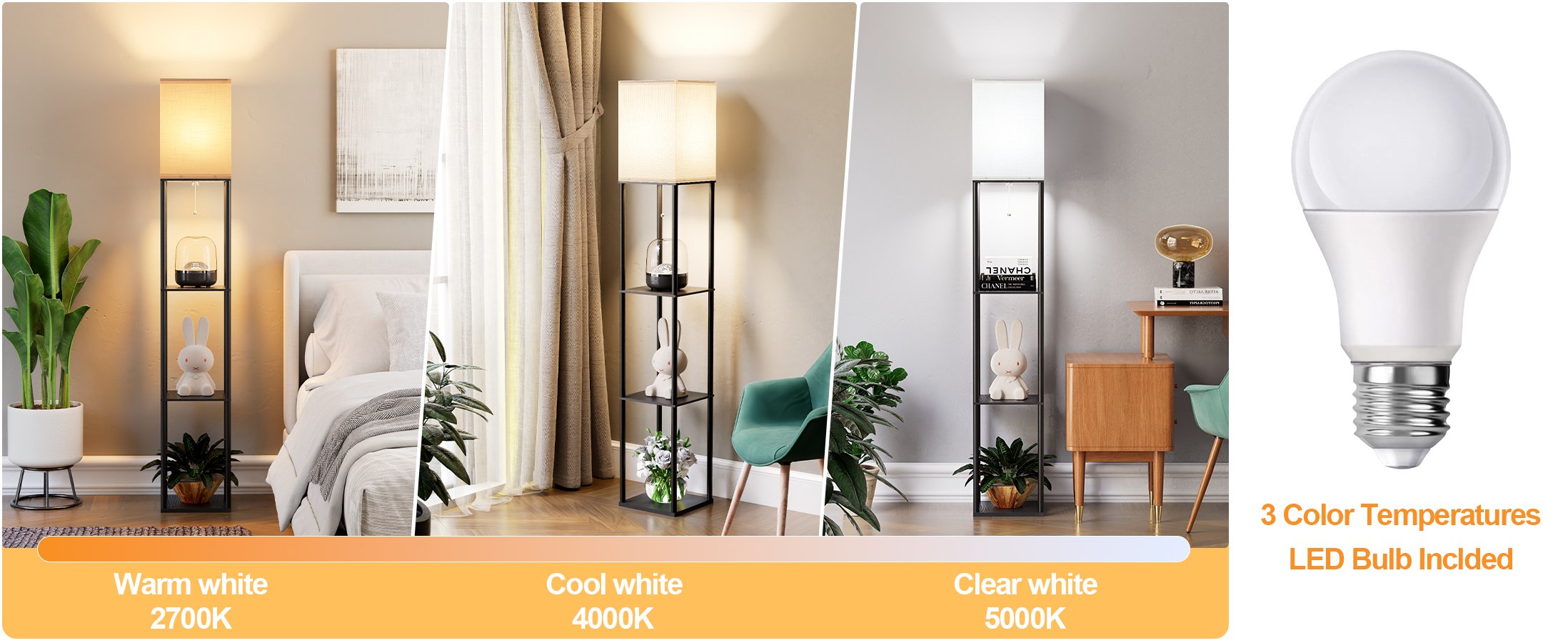 shelf lamp includes a 9 Watt, 800 lumen energy saving LED bulb. The LED bulb has 3 color temperatures: 2700K/4000K/5000K. You can switch different color temperatures by pulling the pull chain twice within 10 seconds. Also the led bulb has memory function, it will remember the light color last time you chose.