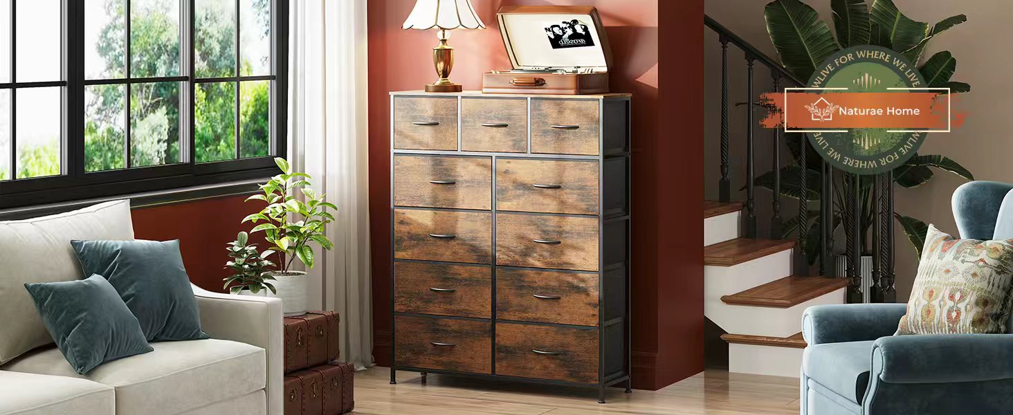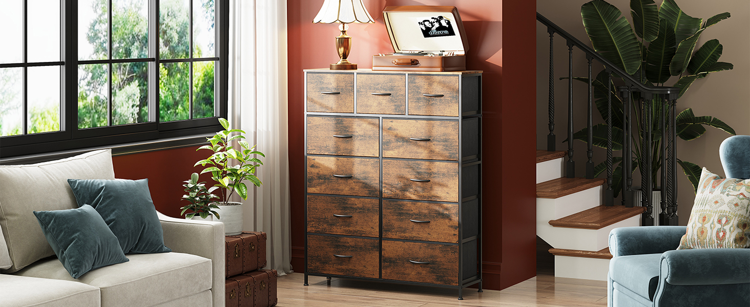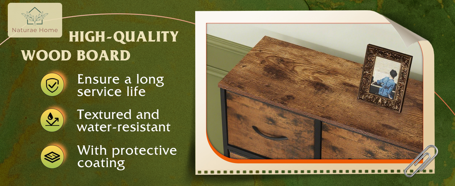 The 11 foldable deep drawers are so spacious that they provide endless organizational possibilities. Wooden top is great for lamps, clocks, glasses and other daily essentials, keeping them in your reach.