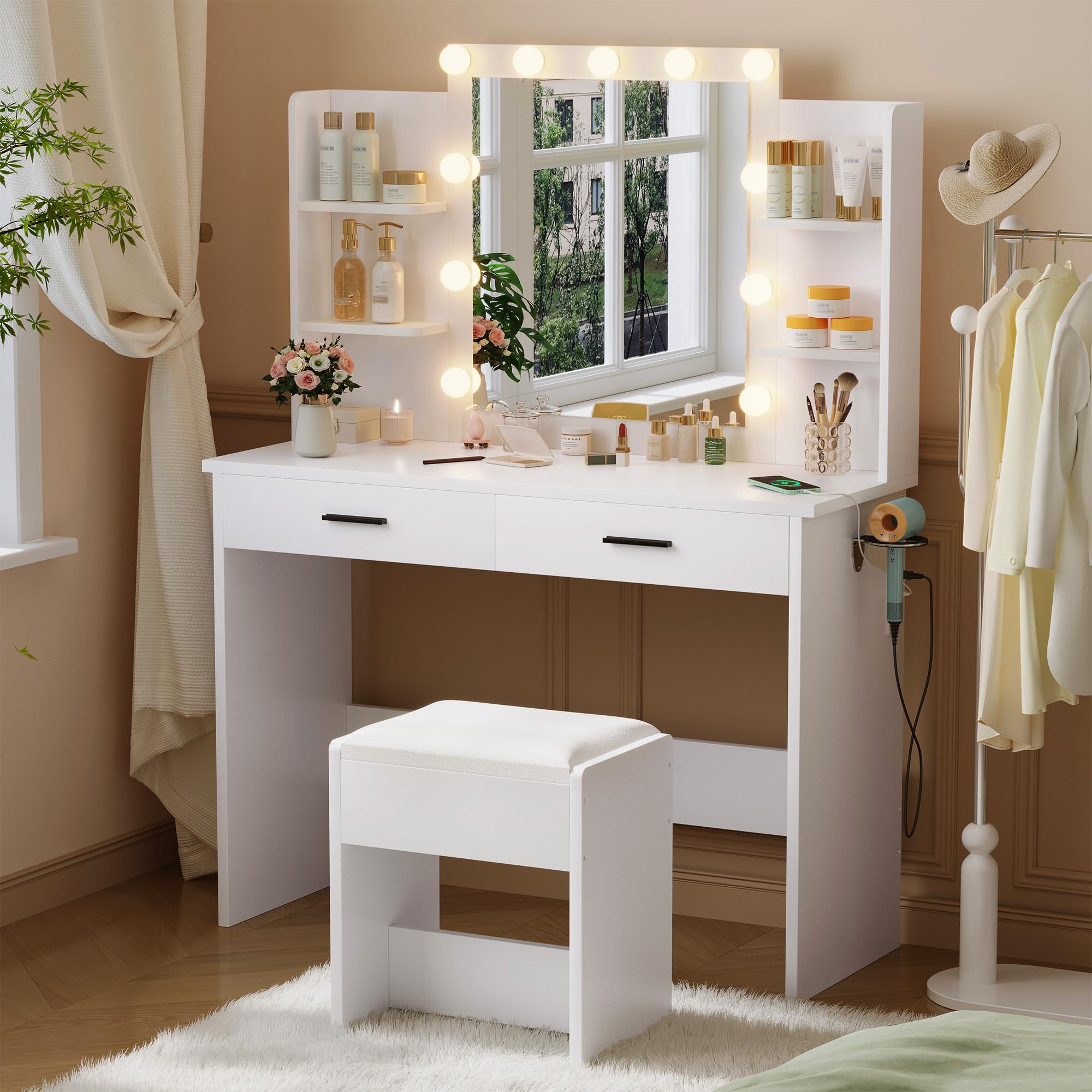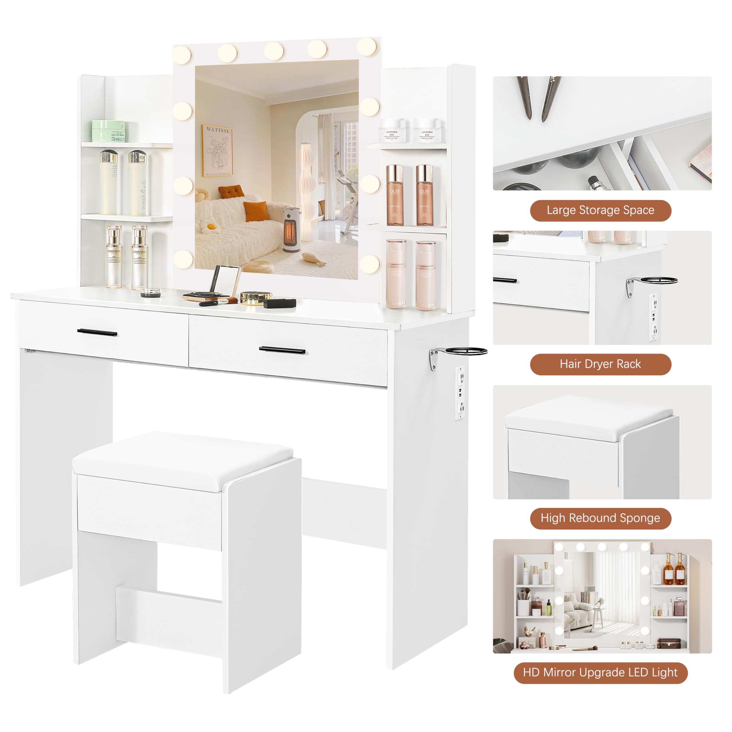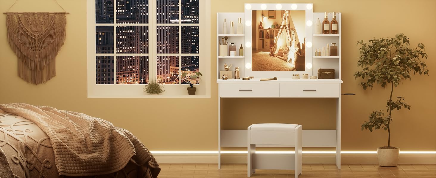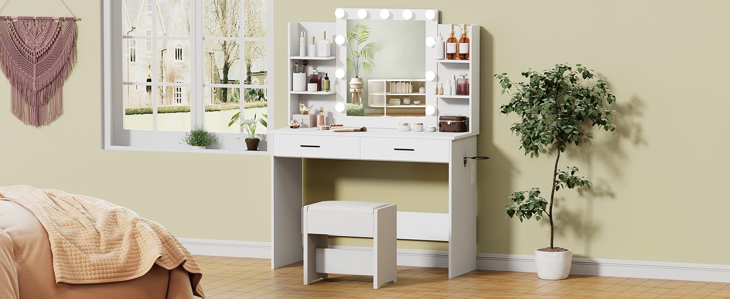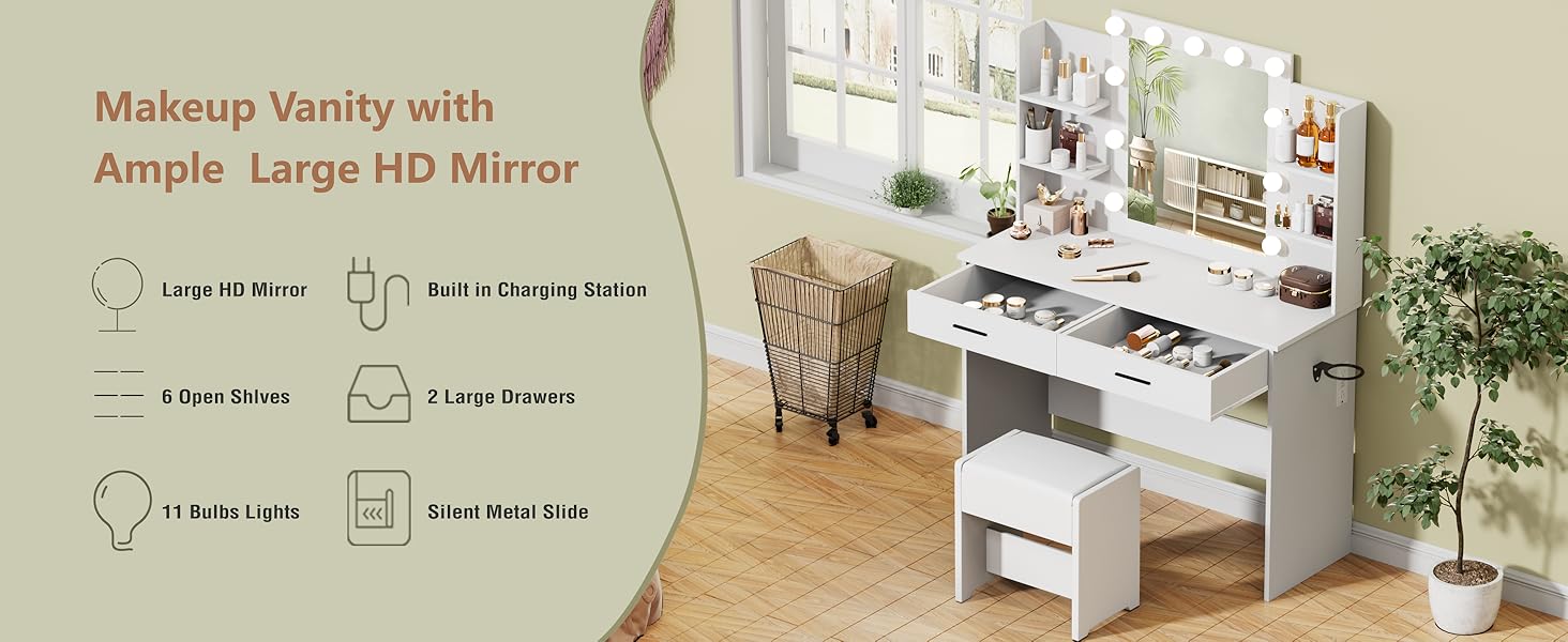🏷️【Soft-Padded Stool 】Comes with a upholstered stool for comfortable seating. The size : 15.7"D x 42.5"W x 55.9"H, fits snugly in bedrooms or dressing areas without sacrificing functionality.