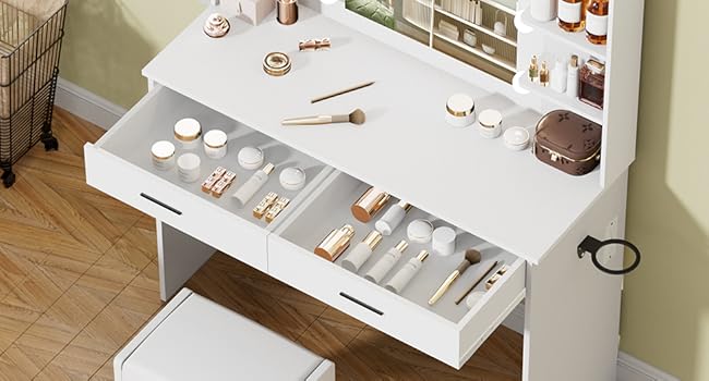 👒【Spacious & Stylish Design 】Includes 2 smooth-gliding drawers and additional open shelving to organize skincare, jewelry, or accessories—keeping your essentials visible yet dust-free.