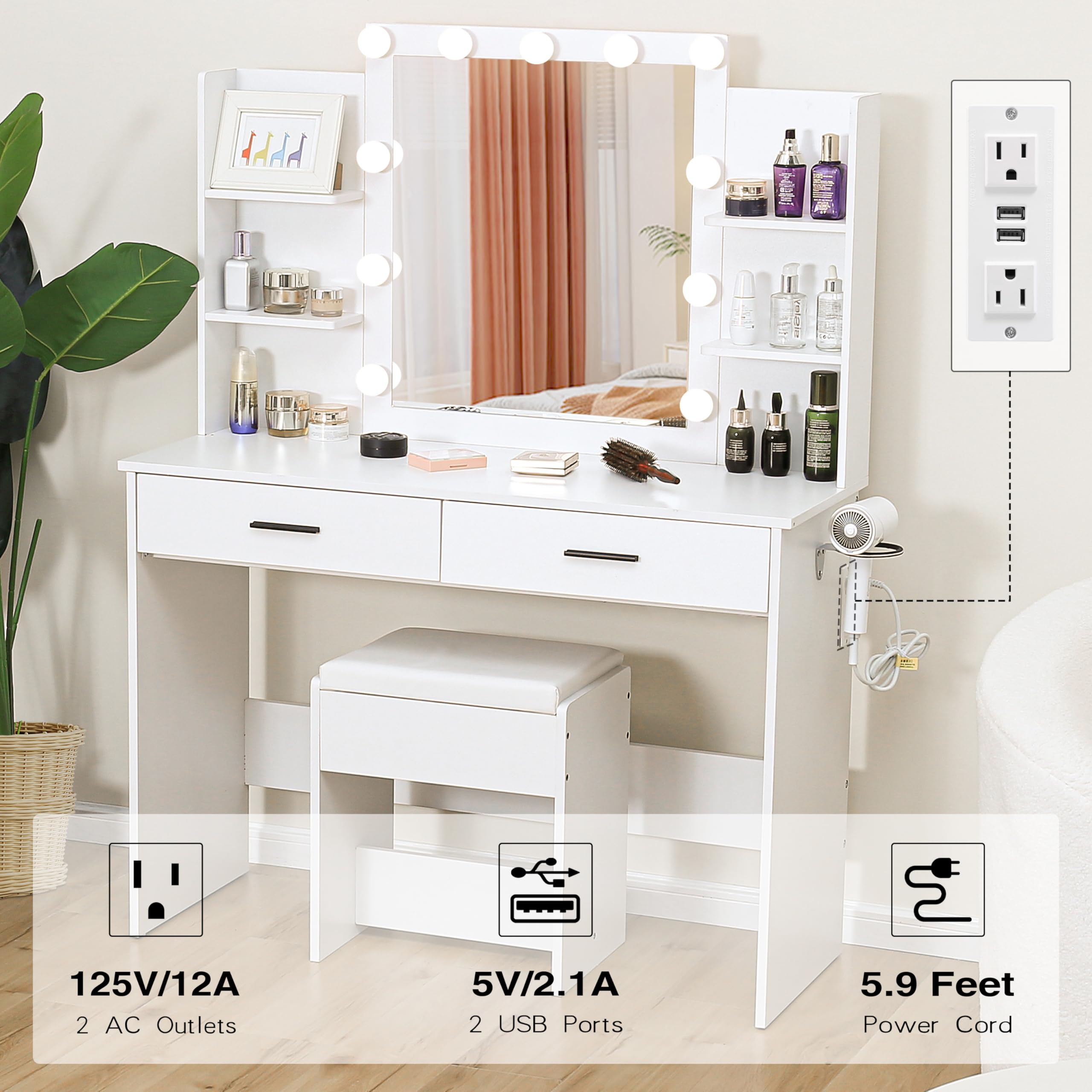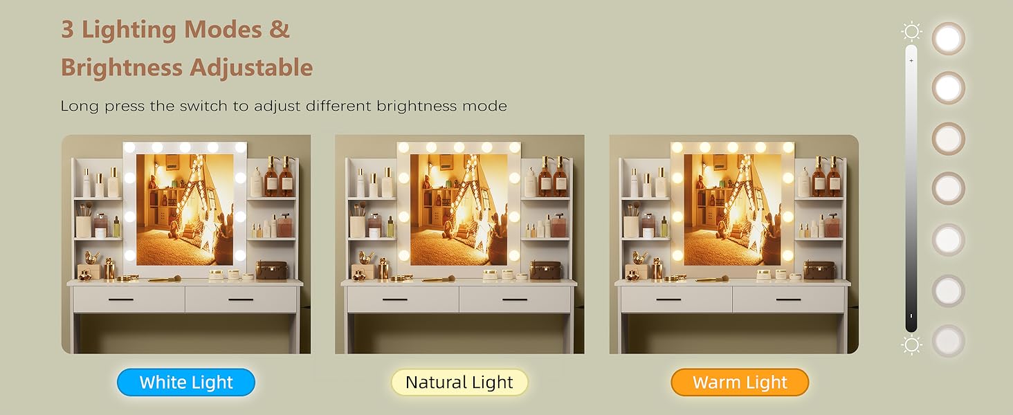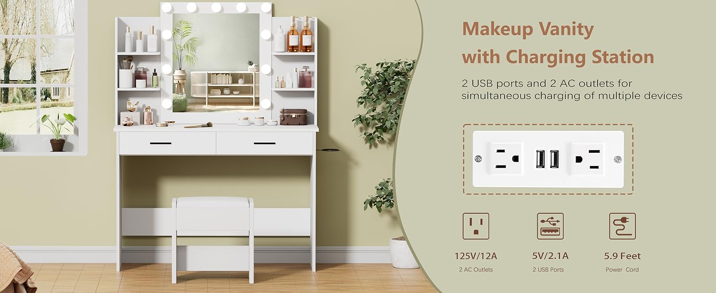 🔔【Built-in Charging Station】Conveniently designed with a 4-in-1 Charging Station(for phones/tablets) and a side-mounted blow-dryer holder, eliminating cord clutter while streamlining your beauty routine.